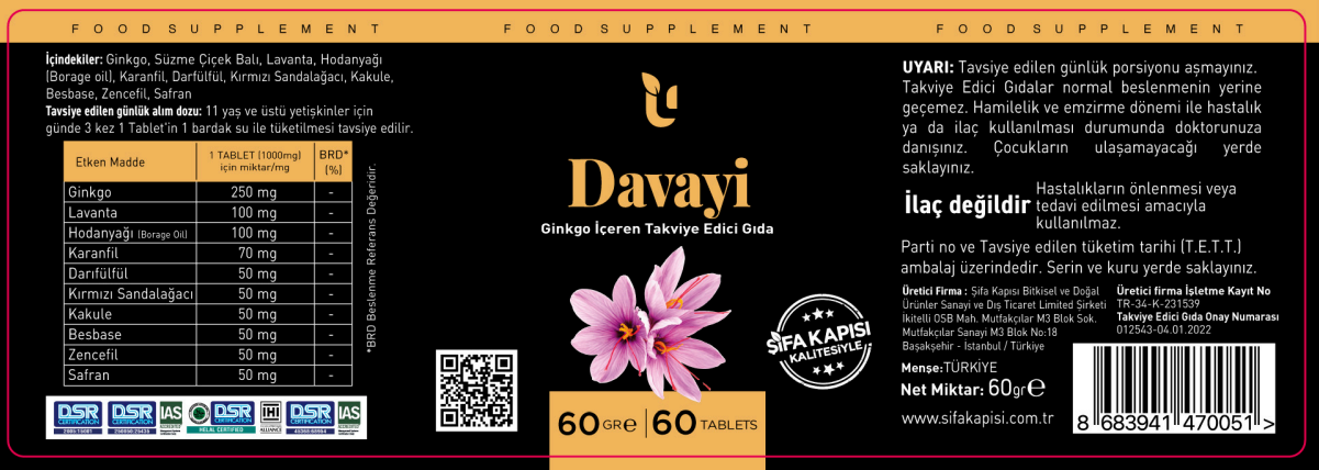 Davayi, ginkgo içeren takviye edici gıdadır. İçeriğinde ginkgo, lavanta, hodanyağı, karanfil, darfülfül, kırmızı sandalağacı, kakule, besbase, zencefil ve safran yer almaktadır. Tavsiye edilen günlük alım dozu 11 yaş ve üstü yetişkinler için günde 3 kez 1 tabletin 1 bardak su ile tüketilmesidir.